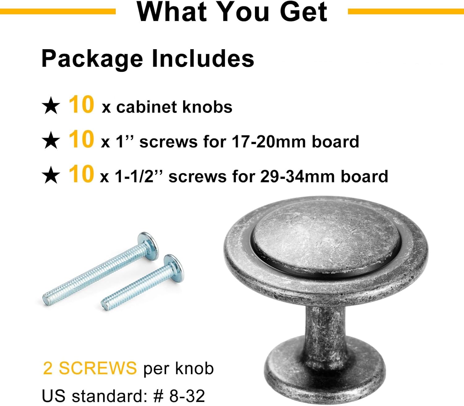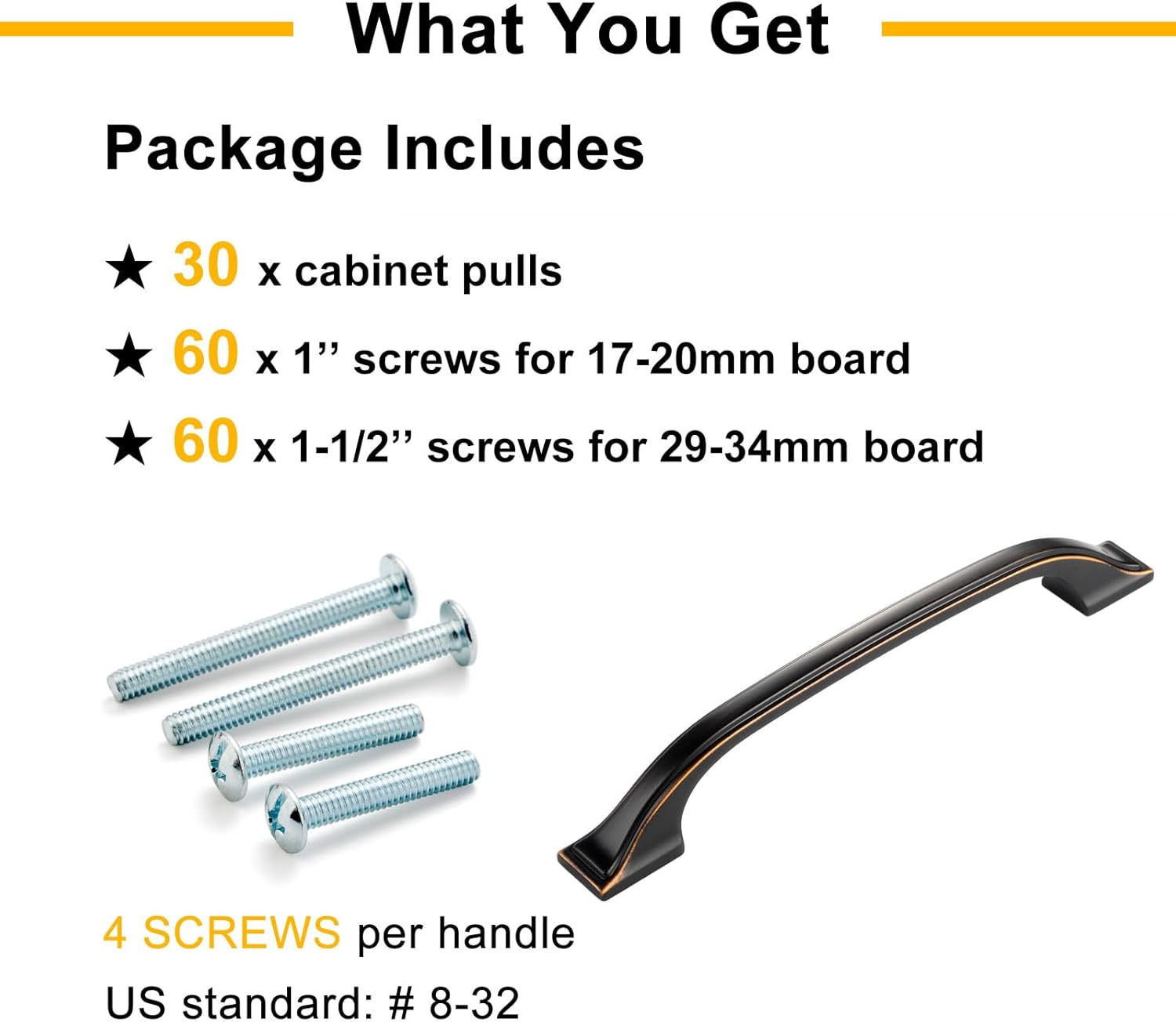 • [Two sizes of screws provided]: Each pull comes with 2 sizes of 8-32 screws (1 inch & 1-1/2 inch) which fit most cabinet doors and drawers.