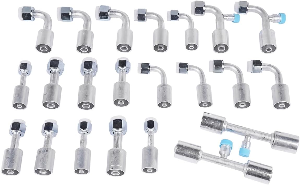 SpecificationsAir Conditioning Hose Size: #6 Hose -- 2m/about 6.5ft. long, 5/16", I.D. 8.2±0.4mm, O.D. 19±0.5mm; #8 Hose -- 2m/about 6.5ft. long, 13/32", I.D. 10.5±0.4mm, O.D. 23±0.5mm; #10 Hose -- 2m/about 6.5ft. long, 1/2", I.D. 13±0.4mm, O.D. 25.4±0.5mm;Air Conditioning Fitting Size: #6 Fitting -- 5/8-18UNF; #8 Fitting -- 3/4-16UNF; #10 Fitting -- 7/8-14UNFMaterial: Hose -- rubber and plastic; Fitting -- iron with color zinc-plated finishedPackage Includes(As Pics Shown)1 PC #6 AC Hose, 1 PC #8 AC Hose, 1 PC #10 AC Hose, 3 PCS #6 AC Fittings(Straight), 3 PCS #6 AC Fittings(90 Degree), 3 PCS #8 AC Fittings(Straight), 3 PCS #8 AC Fittings(90 Degree), 3 PCS #10 AC Fittings(Straight), 3 PCS #10 AC Fittings(90 Degree), 1 PC #8 AC Fitting with R134a Valve(Straight), 1 PC #10 AC Fitting with R134a Valve(Straight), 1 PC #8 AC Fitting with R134a Valve(90 Degree), 1 PC #10 AC Fitting with R134a Valve(90 Degree), 4 PCS Oring Seals for #6 Fitting(6.8*19mm), 4 PCS Oring Seals for #8 Fitting(10.8×2.4mm), 4 PCS Oring Seals for #10 Fitting(13.8×2.4mm), AC Receiver Drier
