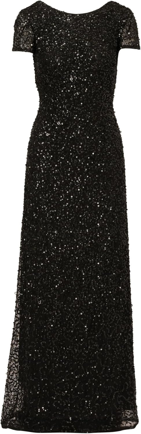 Unleash the glamour at your next formal event in this striking sequin evening dress. This gorgeous sequin gown is filled with fabulous features, including short sleeves, a long, flowing soft skirt, a crew neck and a scoop back with a subtle back zipper closure. All-over embellishment and show-stopping train detail renders this special occasion dress one of a kind. Pair this stunning short sleeve sequin gown with a bold, red lip and strappy heels to steal the show.