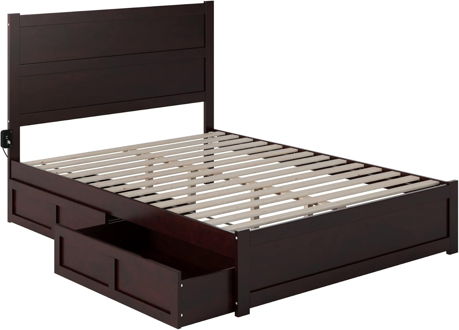 Keeping your space nice and clean has never been easier with this NoHo platform bed! These beautifully added bed drawers, fit seamlessly underneath and offer the perfect amount of storage space. Functionality has never looked this good! Crafted from a mix of solid hardwood and veneers for durability, you will rest easy at night knowing you are fully supported. A strong, supportive, slat kit means there is no need for a foundation as the mattress sits perfectly on top of the slats and side rails, offering extra support and the perfect amount of airflow! Attach the included charging station to keep all your favorite devices charged and ready to go after a great night’s sleep!