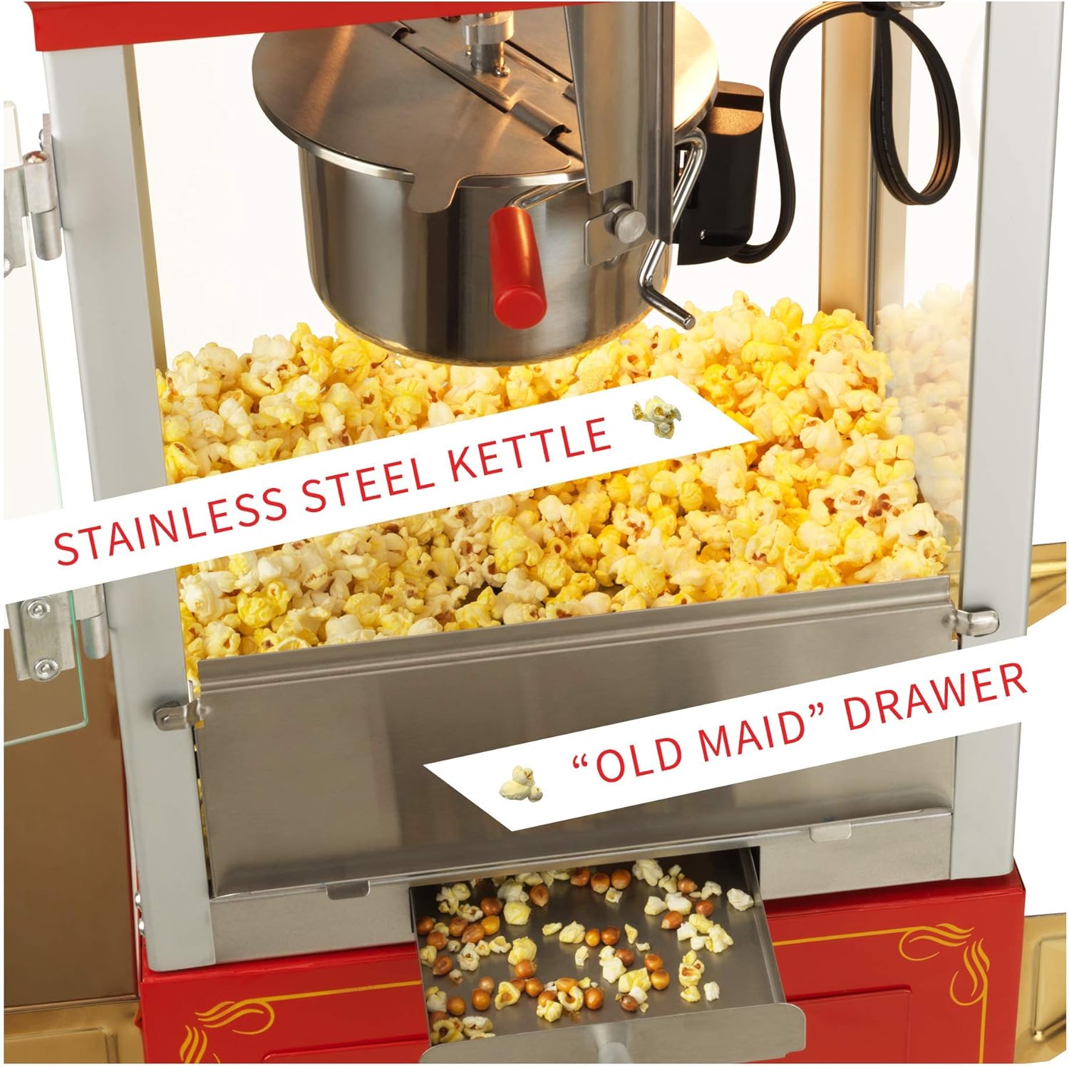 All Funtime machines feature a stainless-steel hot oil kettle with a built in stirring system. Flip-up lid allow the popcorn to come pouring out as it pops. Pull-out kernel catcher separates unpopped kernels from your popcorn as you scoop it. They offer an easy-to-clean design and is built to pop mountains of irresistible theater style popcorn! Large 4oz stainless steel hot oil kettle that heats up quickly and disperses heat evenly to maximize the amount of kernels popped. It's also equipped with a free-moving lid assembly so popped corn easily exits the kettle on its own. Its stainless steel construction makes it easy to clean and maintain. Dimensions: 56.5"h X 15"w X 25"d.