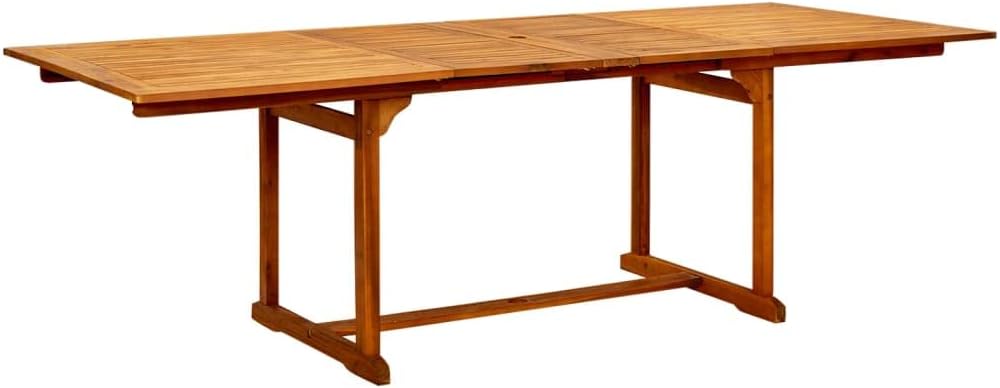This wooden garden dining table adds a touch of rustic charm to your garden, terrace, or patio!The outdoor table is made of solid acacia wood, a tropical hardwood, which is weather-resistant and highly durable. The oil-finished surface also makes it easy to clean with a damp cloth. Thanks to its special design, this garden table can be extended when extra space is required.Note: In order to extend the life of your outdoor furniture, we recommend you to clean it regularly and do not leave it outdoors without protection unnecessarily.Clean: Use a mild soap solution.Storing: If possible, store in a cool, dry place indoors. If the product is stored outdoors, protect it with a waterproof cover. Wipe and dry the excess water or snow from flat surfaces after a rain or snowfall. Allow sufficient air circulation to avoid moisture-related damage.Material: Solid acacia wood with an oil finishDimensions: (63"-78.7"-94.5") x 39.4" x 29.5" (L x W x H)ExtendableAssembly required: YesNote: The tabletop contains two extendable panels.