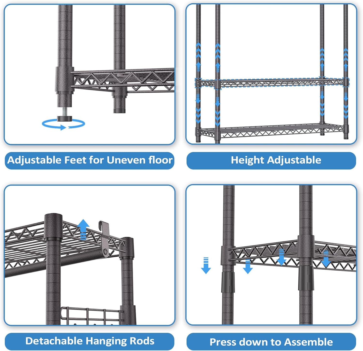 Heavy Duty Rolling Garment Rack by IZEUK Constructed from premium carbon steel with anti-rust coating for durability and stability Features 3 adjustable wire shelves, sturdy hanging rod, and side hooks for versatile storage Measures 29.5" W x 15.7" D x 75" H with heavy-duty caster wheels, 2 are lockable for mobility and safety Easy assembly with step-by-step instructions; assembly tools not included; dedicated customer support available