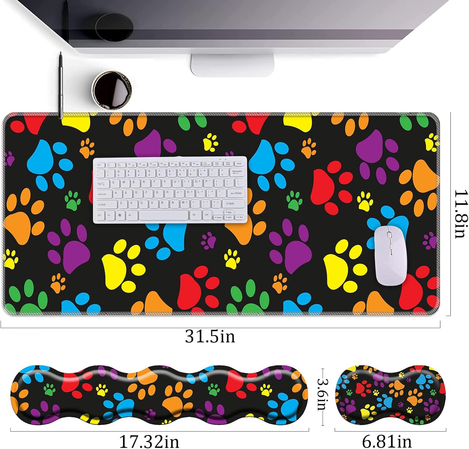 • 【Standard Size:】4-in-1 Wrist rest set.1*Keyboard wrist rest(17.32 x 3.6 x 0.98 inch).1*Mini wrist rest(6.81 x 3.6 x0.98 inch). 1*Desk pad mat(31.5x 11.8 inch). Ultra large size for optimal gaming. Wrist rest pad set provides comfortable support to your wrist while gaming or typing.