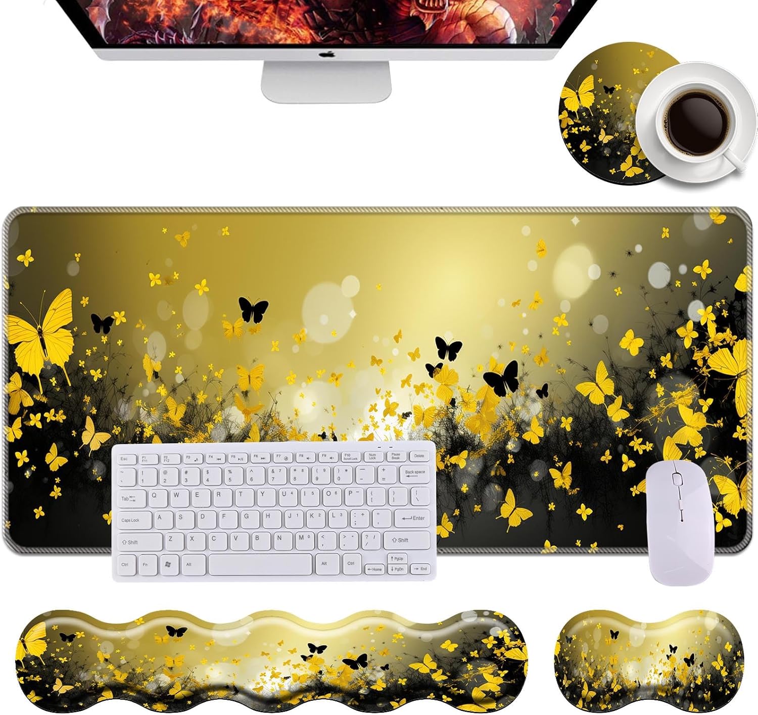 Are you tired of using a normal mouse pad for your daily work, study and play? Then you can try our mouse pad set. Perfect for gamers, office workers, writers, editorial designers, students, and those who work long hours on PCs, laptops, laptops, and computers. Why choose us: 👉 Material and Features This mouse pad is designed with microfiber woven material and has a micro-textured cloth surface that is soft and stretchy, giving you more control over your mouse. Delicate and durable edge stitching prevents the mouse pad from fraying and debonding. Easy to wipe and ready to use. 👉 Accurately track surfaces Allows more accurate and faster mouse movement and provides excellent click accuracy. 👉 Anti-slip PU base Anti-slip rubber base provides heavy grip and prevents slipping or unwanted movement. Suitable for different surface conditions. 👉 Ergonomic Design The curved shape of the wrist rests is ergonomic designed which provides soft support to maximum reduce wrist stress and tiredness on your wrists.the wrist supports make your forearm and shoulder in a right posture.The raised memory foam filled wrist supports provide soothing and relaxtion while you using computer and stimulate blood circulation. 👉 perfect gift The mouse pad set is the perfect office gift for colleagues, friends, teachers, bosses, etc. Specification: Material: Memory foam, Non-slip PU base and Lycra silky cloth surface Size: Keyboard wrist rest 17.32 x 3.6 x 0.98 inch Mini wrist rest 6.81 x 3.6 x0.98 inch Desk pad mat 31.5x 11.8 inch Package includes: 1 x Keyboard wrist rest 1 x Mini wrist rest 1 x Desk pad mat 1 x Coffee Coaster Any pattern of our mouse pads are handpicked to ensure a superb look.If you have any questions during use, please contact us and we will help you!