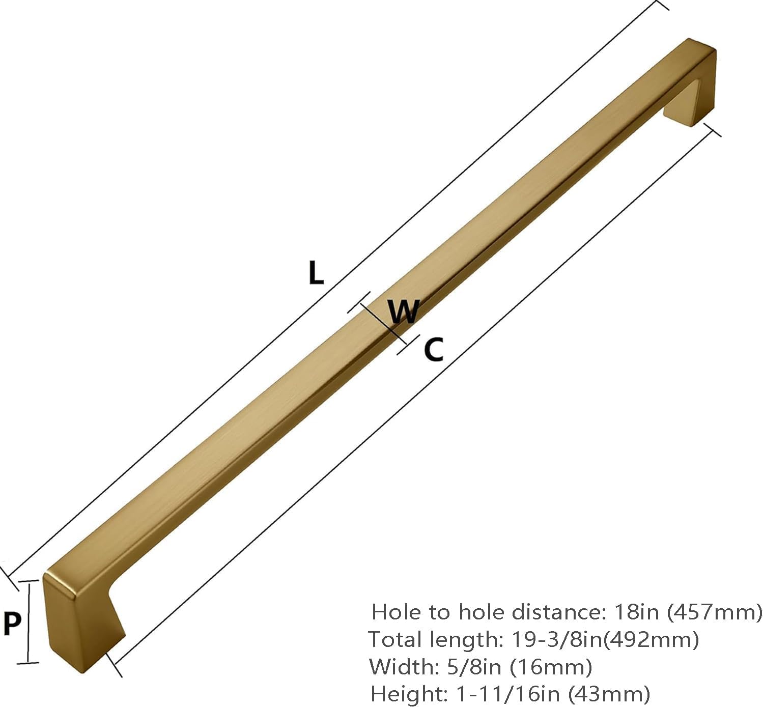 • Hole to hole distance: 18in (457mm) Total length: 19-3/8in(492mm) Width: 5/8in (16mm) Height: 1-11/16in (43mm)