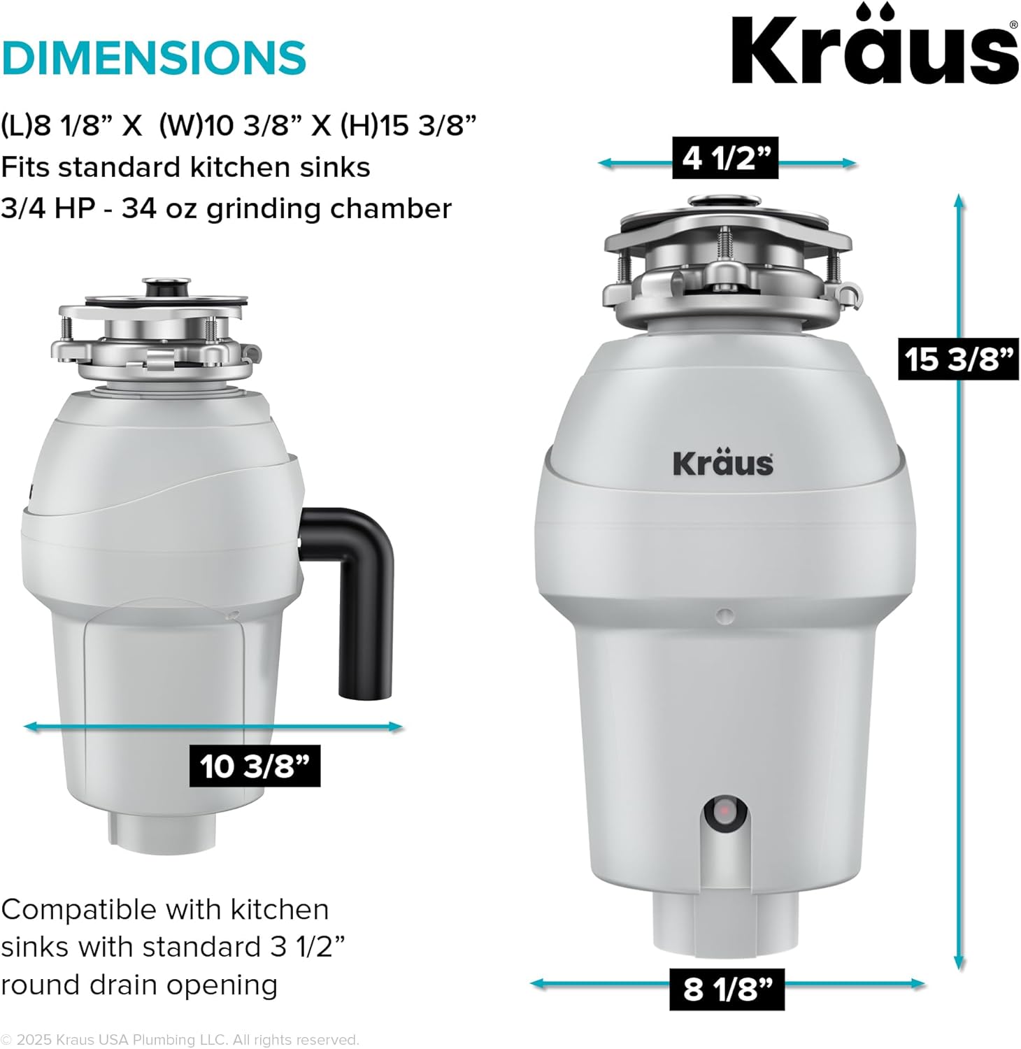 Make cleanup easy with a KRAUS WasteGuard Garbage Disposal, featuring a 3800 RPM MagnaGrind motor for fast, powerful operation. Available in 1/3 to 1 HP models for everything from light use to heavy-duty cleanup. Continuous-feed design lets you add waste while the sink disposal is running so you can clean as you go. Durable metal grinding components, QuietStorm soundproofing, and anti-vibration system help ensure lasting, quiet performance. Automatic shut-off with reset button protects motor during jams. Universal 3-bolt mounting with included power cord for plug-in installation or optional hardwiring. Garbage disposal for kitchen sinks comes with power cord, flange, and stopper/plunger. Septic-safe and eco-friendly, these garbage disposers help reduce the use of plastic trash bags.