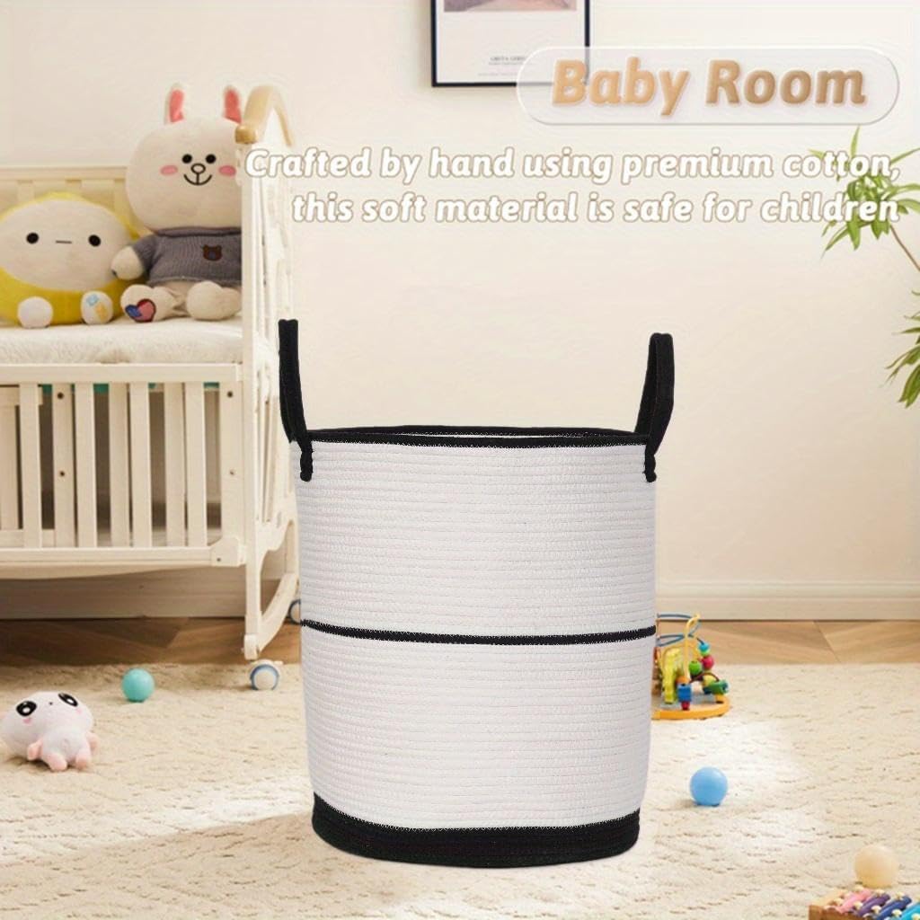 Elevate your home organization with this stylish cotton rope storage basket, perfect for any modern living space. The cylindrical design features a crisp white body accented with striking black stripes and handles, creating a sophisticated two-tone aesthetic. Measuring 16 inches wide by 20 inches high, this generously sized basket offers 3.5 cubic feet of storage capacity for laundry, toys, blankets, or clothes. The durable cotton rope construction ensures stability while maintaining a soft, flexible structure that's gentle on your belongings. The freestanding design with sturdy handles makes it easy to transport your items from room to room. Its versatile style seamlessly complements bedroom, nursery, or living room decor, while the open-top design allows for quick access to contents. The clean lines and contemporary pattern make this basket both a practical storage solution and an attractive decorative accent that helps maintain a tidy, organized space without sacrificing style.