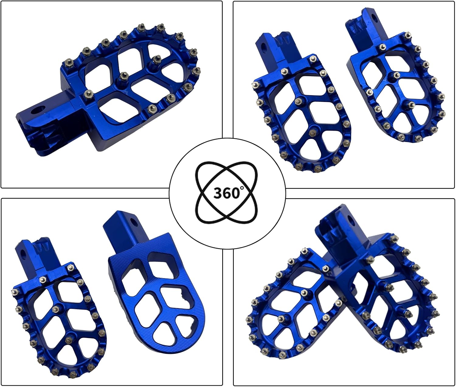 Upgrade your motorcycle's foothold with these premium CNC-machined foot pegs designed for superior grip and control. The aggressive tooth pattern along the edges combined with strategically placed steel studs provides exceptional traction in all riding conditions. Crafted from high-strength aluminum with a sleek black anodized finish, these foot pegs offer both durability and style. The wide platform design increases stability and comfort during long rides, while the honeycomb-style cutouts help shed mud and debris. Installation is straightforward with the included mounting hardware. These foot pegs are perfect for off-road adventures, daily commuting, or track days where reliable foot placement is crucial. The robust construction ensures they can withstand intense riding conditions while maintaining their aggressive grip characteristics. Their versatile design makes them suitable for various motorcycle models, offering a significant improvement over standard pegs in both functionality and appearance.