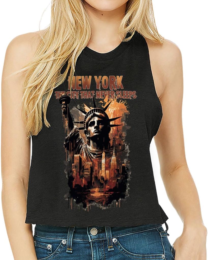 Cute and flattering New York Never Sleeps Racerback Cropped Tank is suitable for most indoor or outdoor activities, such as gym, yoga, running, hiking, beach or relaxing around the house. Pair Statue Of Liberty Women's Tank with your favorite sports bras, especially strappy ones, and high-waisted leggings, then you will enjoy cool and comfortable exercise throughout the summer.