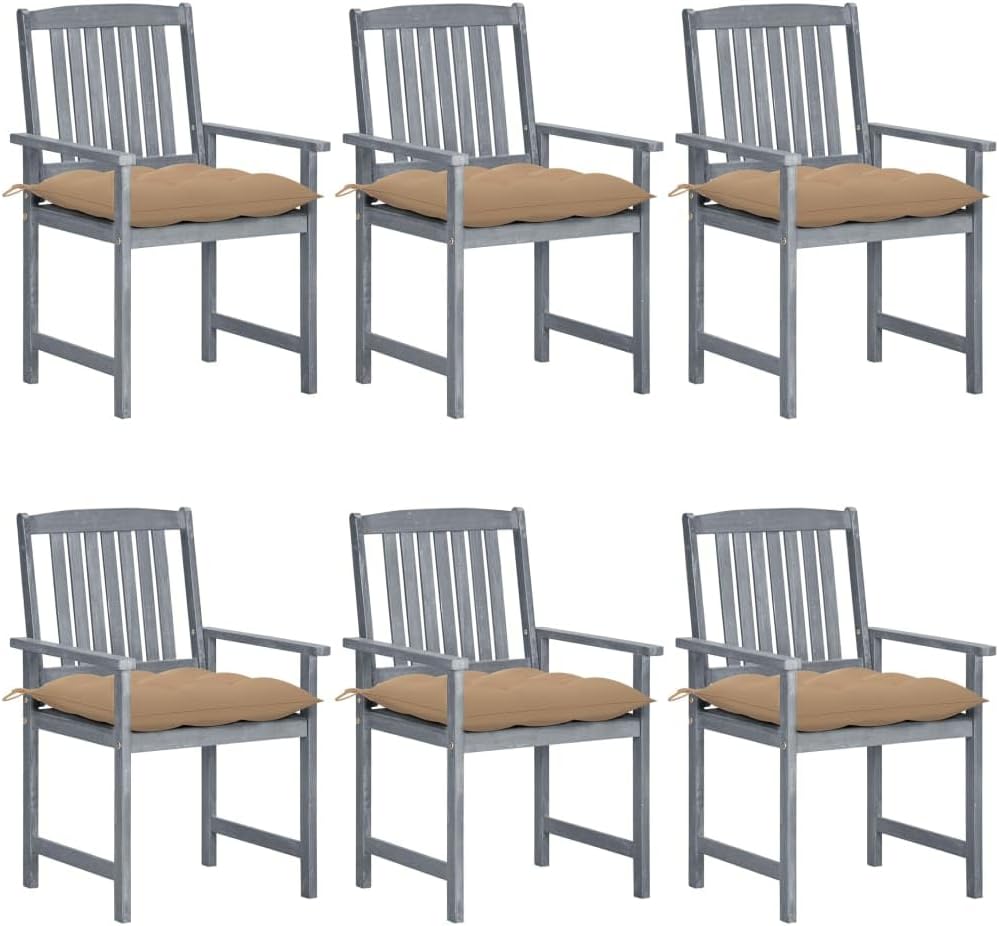 Decorate your outdoors with these slatted wooden patio chairs, adding a touch of rustic charm.These garden chairs are made of solid acacia wood, making them sturdy and stable. The cushions add extra comfort. Each cushion features two sets of ropes to fix it on the outdoor chair tightly.Color: GrayColor of cushions: AnthraciteMaterial: Solid acacia wood with a gray wash finishMaterial of cushion: Fabric (100% polyester)Overall dimensions: 22.4" x 23.6" x 36.2" (W x D x H)Seat size: 18.9" x 18.1" (W x D)Seat height from the ground: 17.1"Dimensions of cushion: 19.7" x 19.7" x 2.8" (L x W x T)Assembly required: YesDelivery contains:2 x Chair2 x Cushion