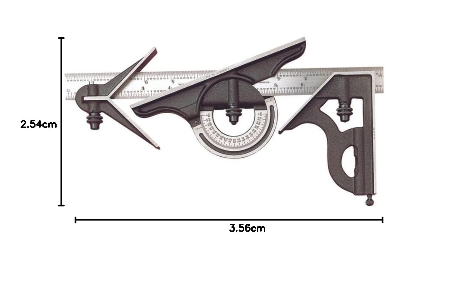 Product Description Combination Square Set, Number of Pieces 4, Head Type Square, Center, Protractor, Blade Length 12 In, Graduation Type 4R, Graduations 8ths/16ths/32nds/64ths, Head Material Hardened Steel, Smooth Black Enamel Finish, Blade Material Hardened and Tempered Steel, Satin Chrome Blade Finish, Features Head has Spirit Level and Hardened Scriber, Includes Combination Blade and Heads From the Manufacturer They are also often used as try squares, center gauges, bevel protractors and rules. 12 in. in size, regular satin chrome blade and protractor head, 8ths, 16ths, quick-reading 32nds, 64ths graduations. With reversible lock bolts, spirit level in both square head and protractor head, direct-reading double 180 degree protractor scale. Square heads and center heads are forged, hardened steel with smooth, black enamel finish.