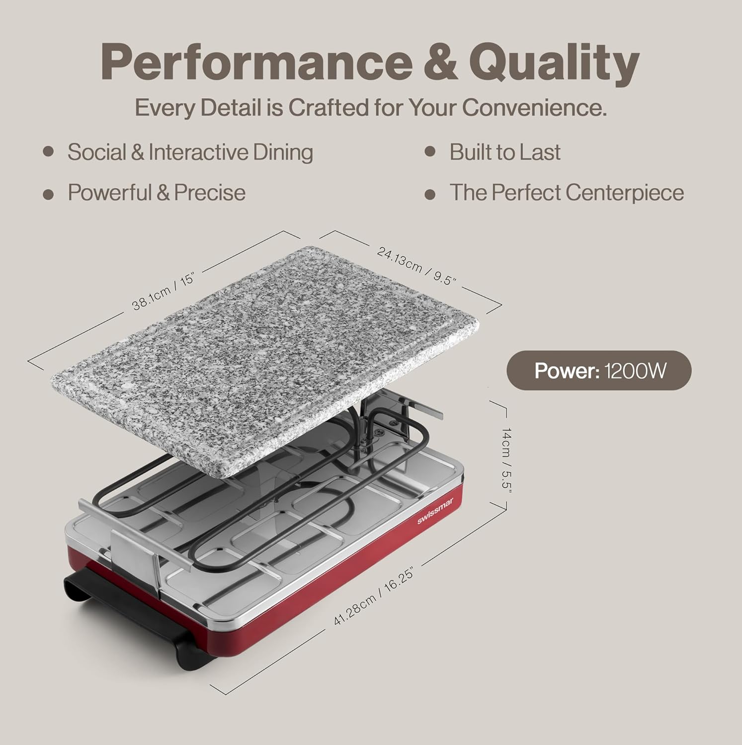 Product Description Add variety (and good taste) to your next dinner party by introducing your guests to healthy and delicious raclette grilling with this classic raclette grill. The nonstick surface grills your favorite meat, seafood and vegetables while your cheese and sauces broil to perfection below. Includes 8 raclette dishes and dish holders and 8 heat-resistant spatulas. The variable heat control helps assure perfect results, no matter the dish. Includes a recipe booklet full of delicious ways to get started. Imported. 5Hx14Wx9-1/2D". Product Built to North American Electrical Standards. Unless otherwise indicated, this product is manufactured for North American electrical standards and is intended for use in the United States and Canada. From the Manufacturer Enjoy a unique and casual dining experience with your Swissmar Raclette, which is considered to be the latest trend in tabletop entertainment. Try a traditional raclette recipe, invent your own grilling sensations or create mouthwatering crepes on the reversible grill top. The possibilities are endless. The Swissmar Classic raclette is equipped with the following: Variable temperature control Reversible non-stick grill top. Perfect for grilling and making crepes 8 raclette dishes 8 heat resistant spatulas