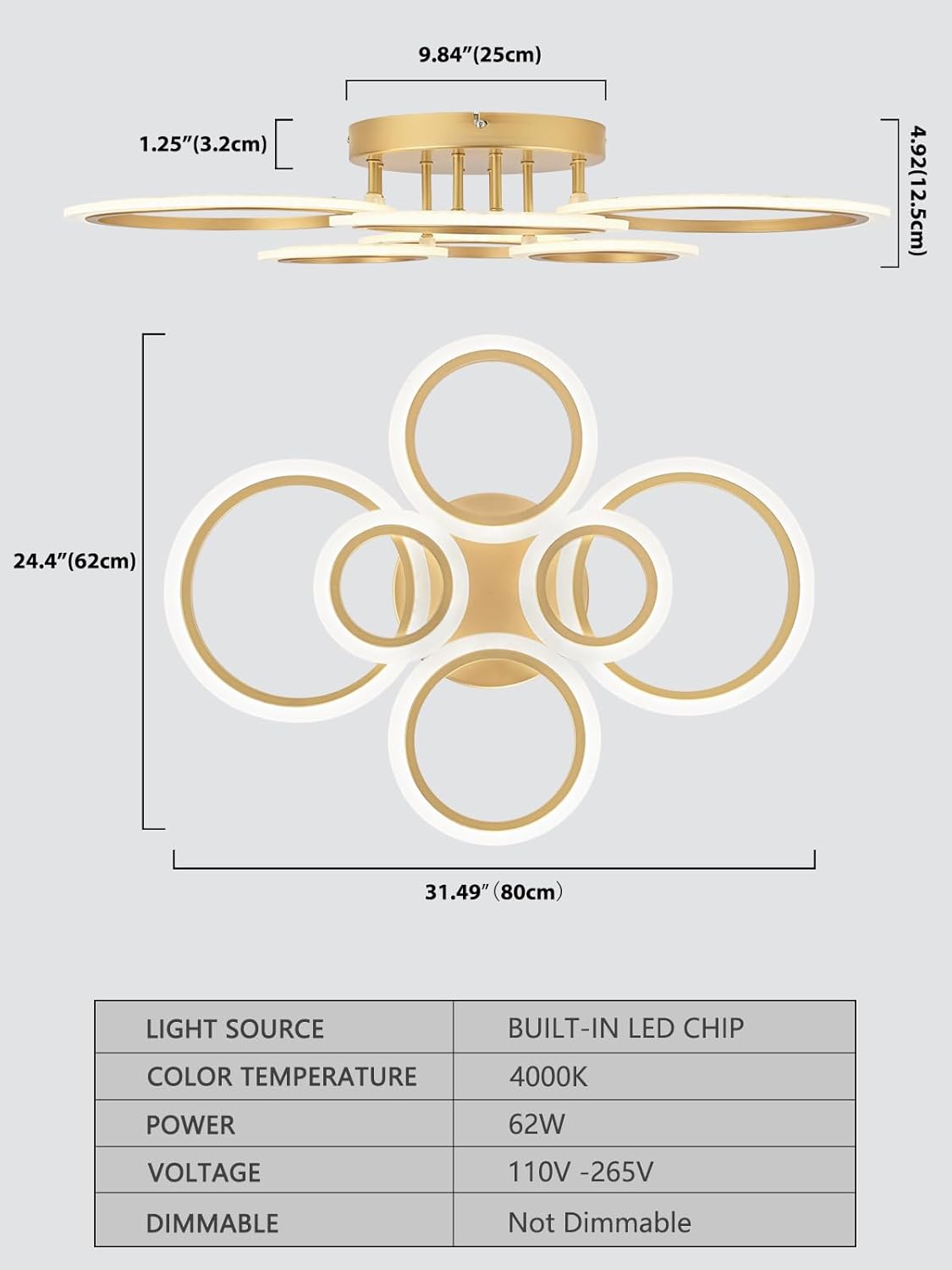 • Energy-efficient LED: Our gold ceiling light fixtures built-in LED chips have energy up to 85% than halogen lamp, with lifespan over 45,000 hours. The dining room ceiling lamps is 100 watts, color temperature is 4000K