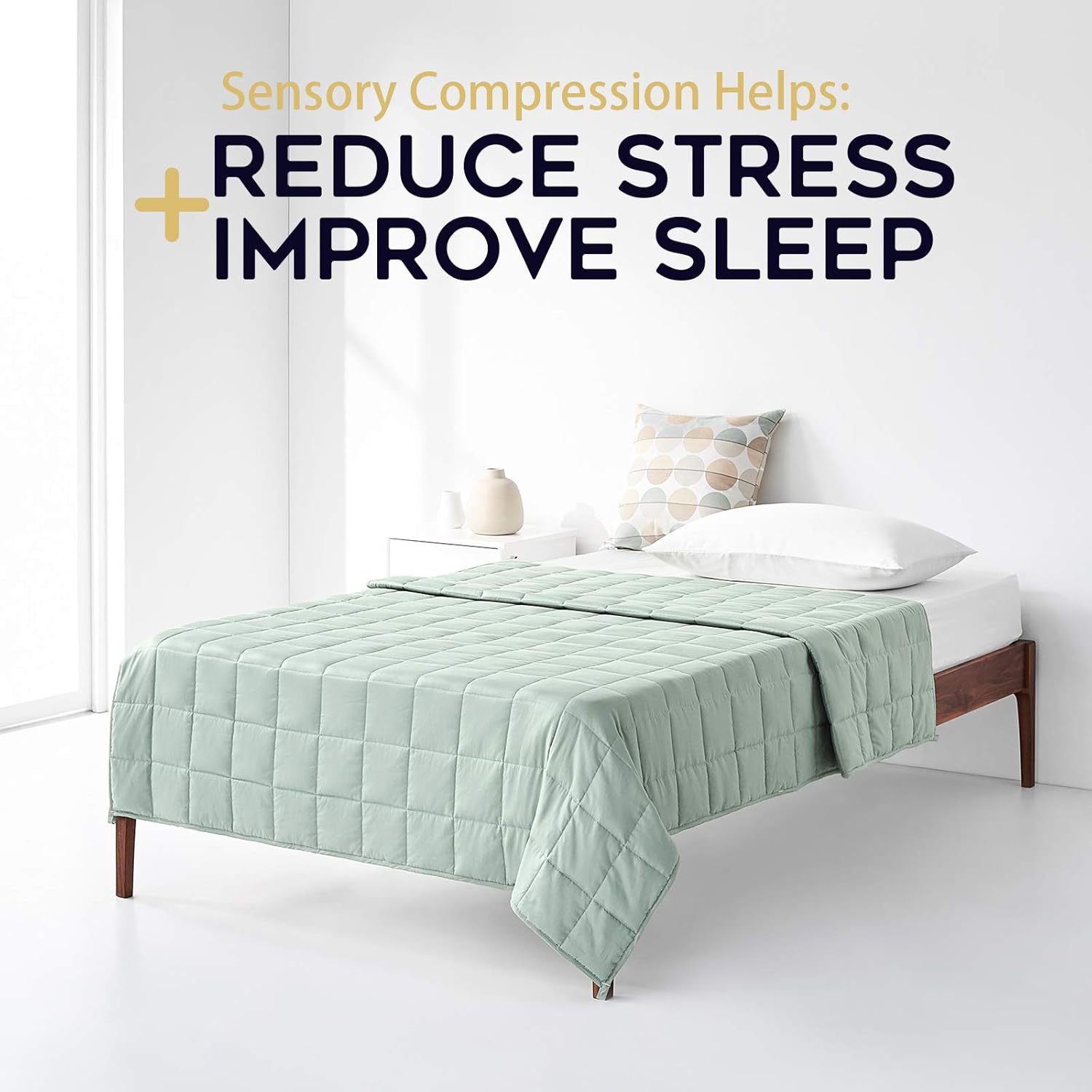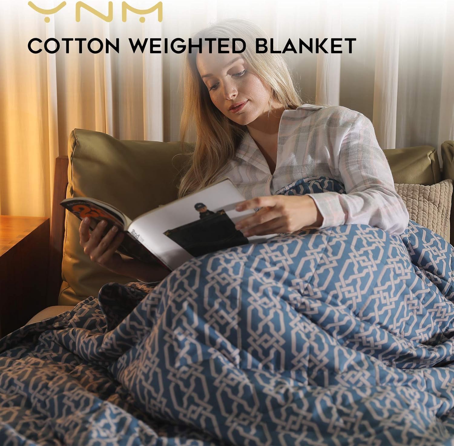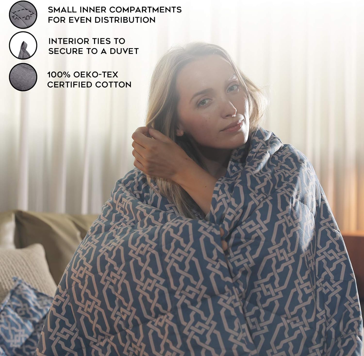 A blanket that feels like a warm, comforting hugFor any adults who get restless at night, our weighted blanket can help them fall asleep better or just relax and wind down after a long, hard day full of studying, playing and adventures. It puts just the right amount of pressure on the body that mimics the feeling of being hugged, held, or swaddled. The cuddle-like, relaxing pressure creates a sense of calmness, promotes a feeling of security to ease restlessness and encourages relaxation during sleep. Let you snuggle in it to feel the warmth on the couch, in the bed, or anywhere.Features:- Seven-layer construction: Our weighted blanket utilizes a seven-layer structure with glass beads locked in a gridded stitching to keep everything in place. - No piling or bunching: Quilted patterns with small 2" x 2" compartments ensure that the beads stay concentrated in their compartments and do not shift around at night. - Anti-leak stitching: The seams and pockets are tightly sealed to prevent beads from leaking out.- Premium fabric made: The outer shell of our heavy duty weighted blanket is made of premium quality fabric for exceptional softness and comfort. - Convenient ties for duvet: Features eight or sixteen ties on each end to keep this weighted blanket strapped to a duvet cover. Benefits of seven-layer construction:- Weight never feels unevenly distributed.- Provides padding against noise when you move around.- Sturdy for several years to come.Weight and size guidelinesLook at our weighted blanket weight chart to find your size. We recommend selecting a weight around 10-14% of your body weight. For assistance, please consult the table.Wash care:Hand wash. Machine wash. Flat dry. Tumble dry low.