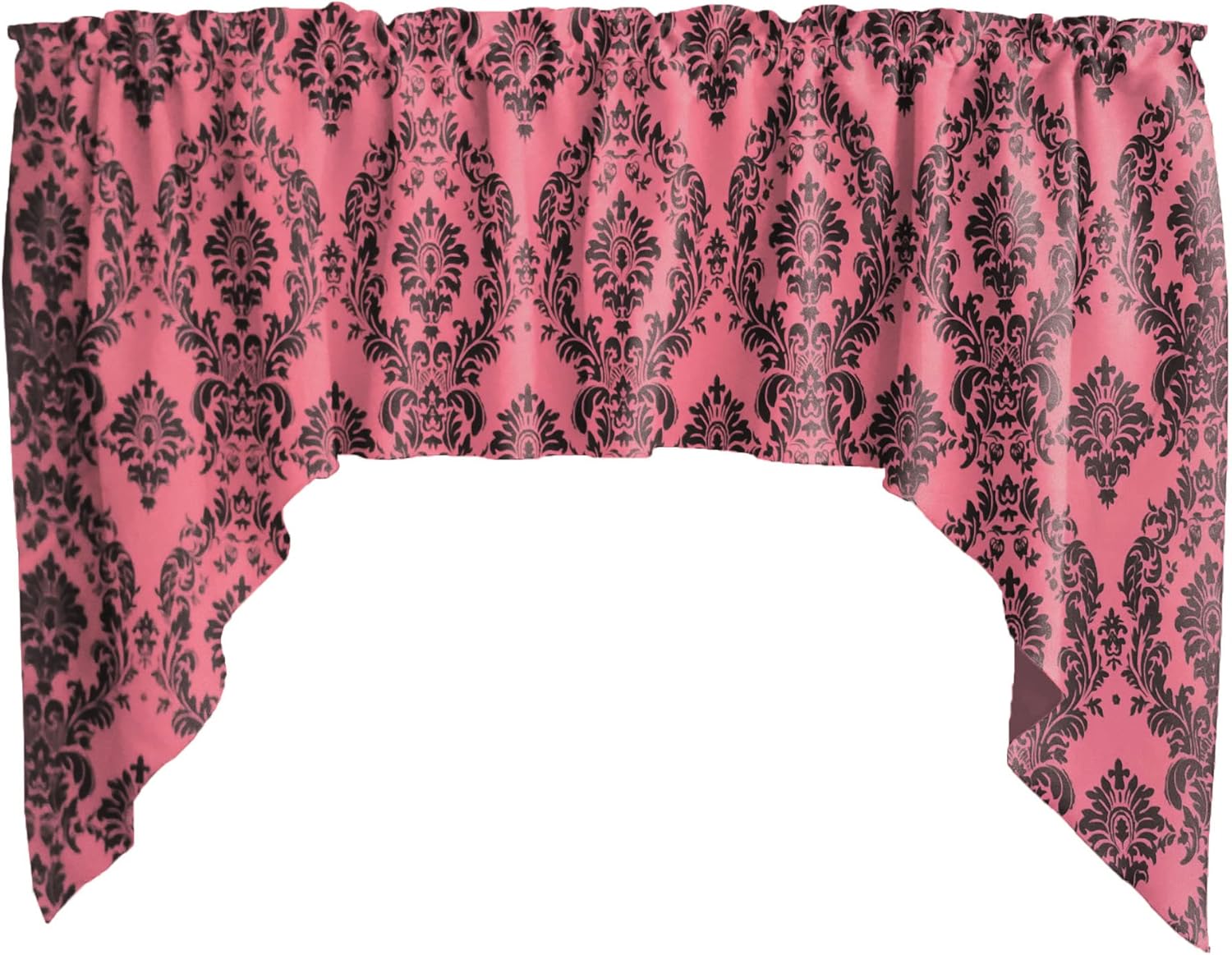 Flocked damask swag valance. This includes a valance with the measurements of 58" wide and 36" tall swag ends, the middle is 18" tall from the top edge. One inch header above a three inch rod pocket at the top of the valance. Multiple colors available. The colors of products when viewed on your computer monitor may appear different than the actual color of the merchandise. We make every attempt to give you a good representation of the available colors for each product sold, but unfortunately we cannot guarantee an exact match. Made in America.